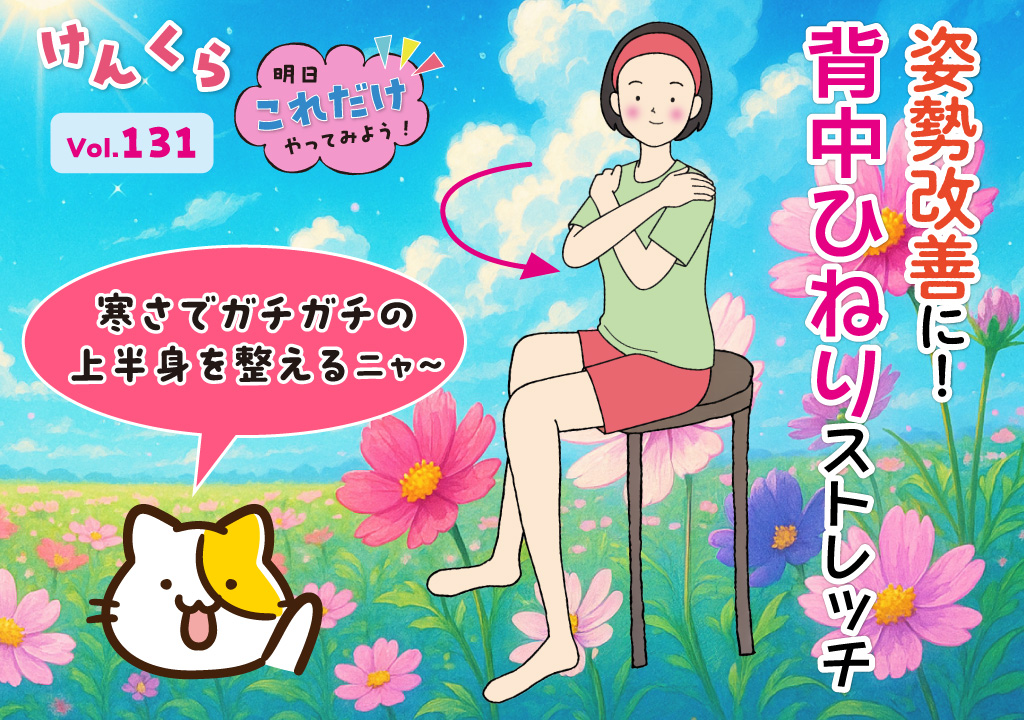 肩や背中の緊張をゆるめ、胸を開いて呼吸を深めるストレッチです。デスクワークや冷えでこわばりがちな上半身を整えます。仕事や家事の合間にもおすすめです。