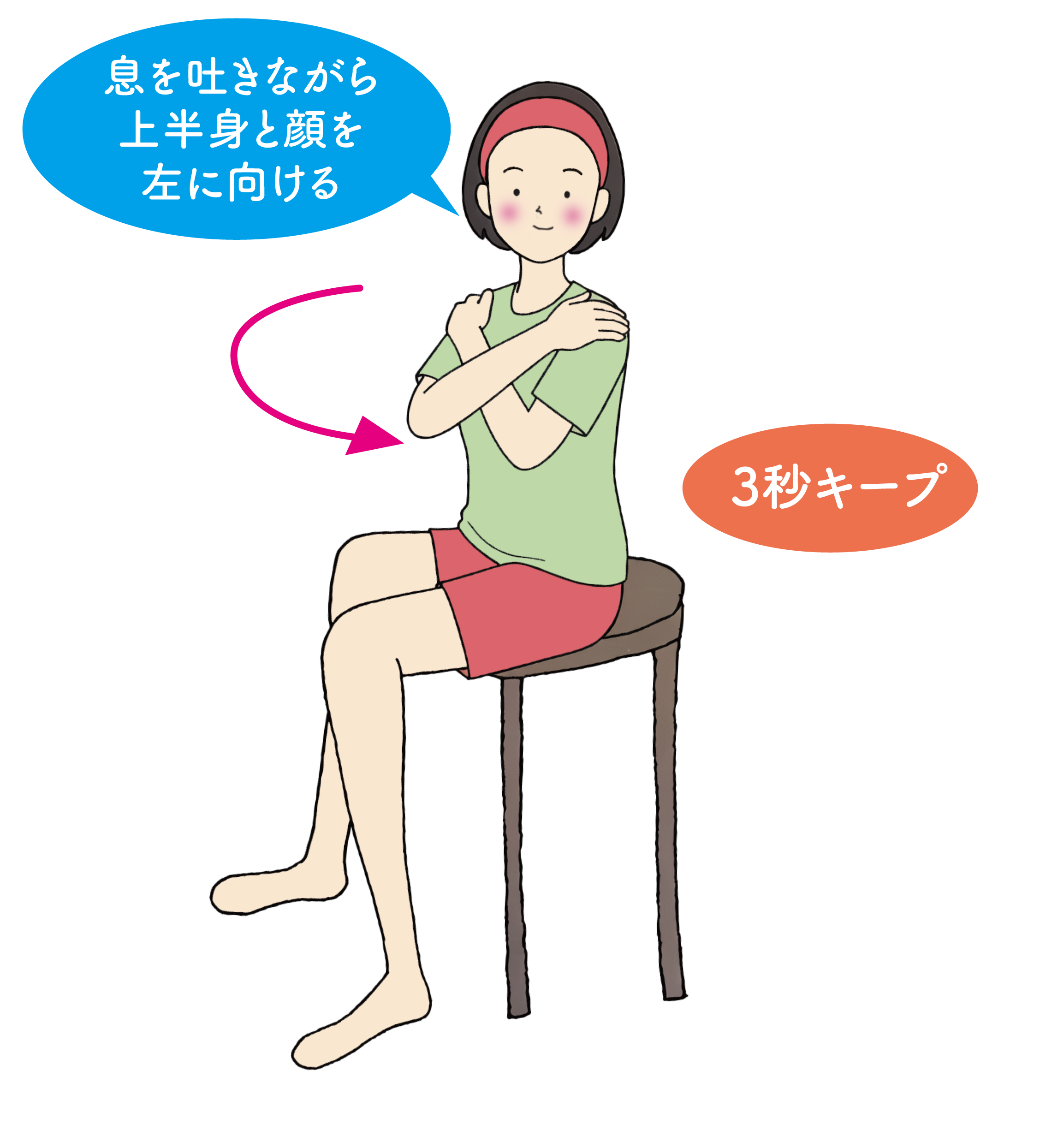 ②息を吐きながら上半身を左へひねり、顔も左を向き、そのまま3秒キープする。