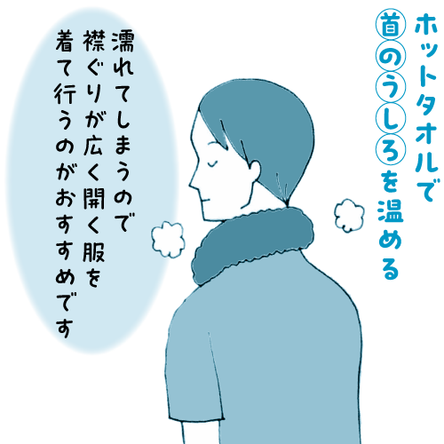 首には血管や神経が集まっているため、自律神経の働きにも深く関わる場所で、首を冷やすだけで自律神経が過剰に働き血行が悪くなりますが、反対に首を温めると血行が良くなり、肩周辺の筋肉の緊張も緩和されるので、肩こりの改善に繋がります。首のうしろを温めるにはホットタオルをおすすめします。