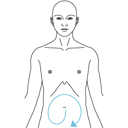 仰向けに寝て、みぞおちの下からへそまで、人差し指・中指・薬指の3つの指を揃えて10秒ずつ息を吐きながら指圧します。手のひらでへそ周りを「の」の字を描くように押し柔らげます。