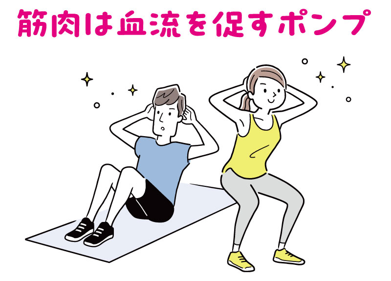 筋肉が動くと、収縮したり伸びたりする動きによって血管を刺激し、血液を押し出すような作用が働きます(筋ポンプ作用)。運動不足や筋肉量の減少があると、この作用が弱くなり、血のめぐりが悪くなってしまいます。
