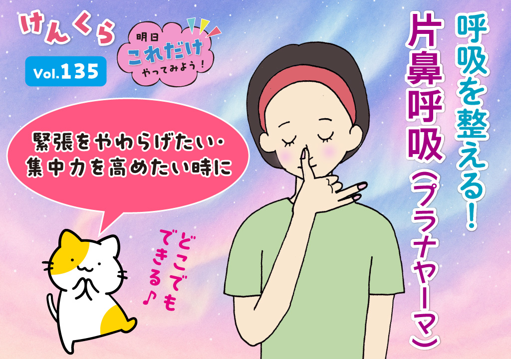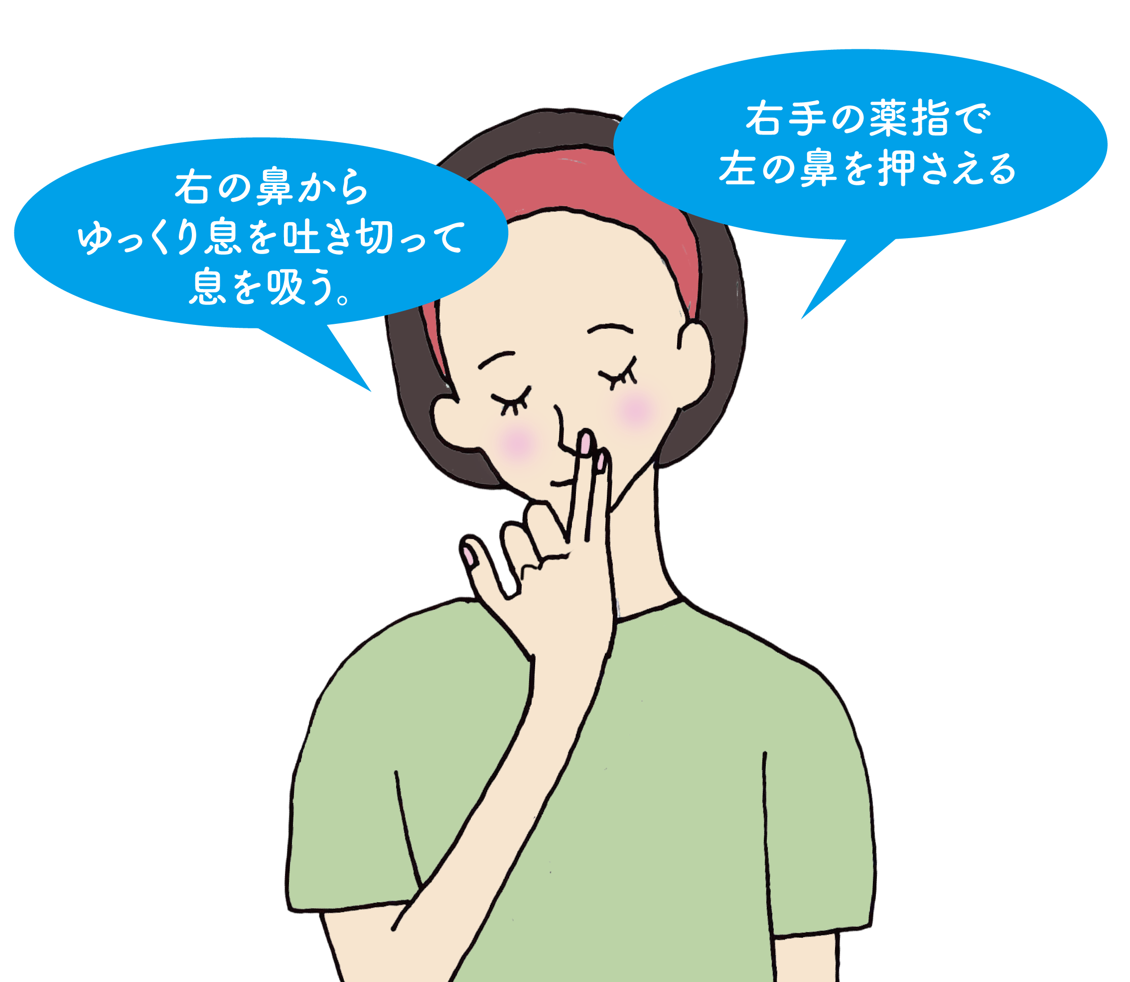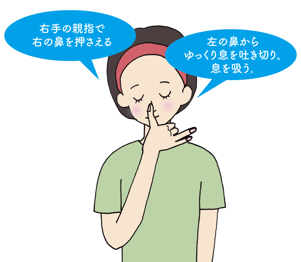 ①右手の親指で右の鼻を軽く押さえ、左の鼻からゆっくり息を吐き切り、左の鼻から息を吸います。