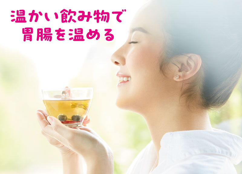 また、冷たい飲み物・生野菜を過度にとるのはなるべく控えるようにします。代わりに白湯やハーブティーをゆっくり飲むことで、胃腸も温まり、めぐりが整いやすくなります。