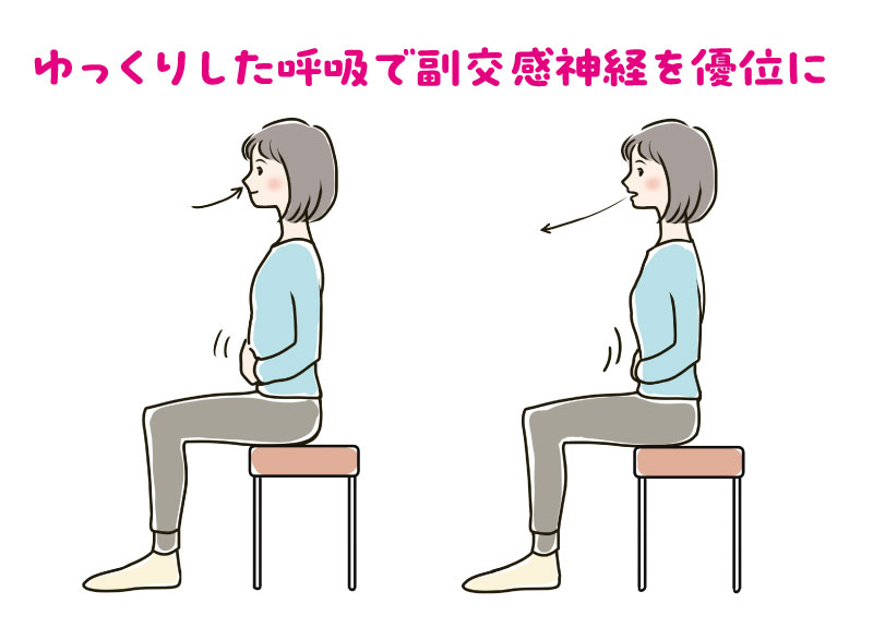 ここで活きるのがゆっくりした呼吸です。とくに吐く息を少し長めにするよう意識すると、副交感神経が働きやすくなります。