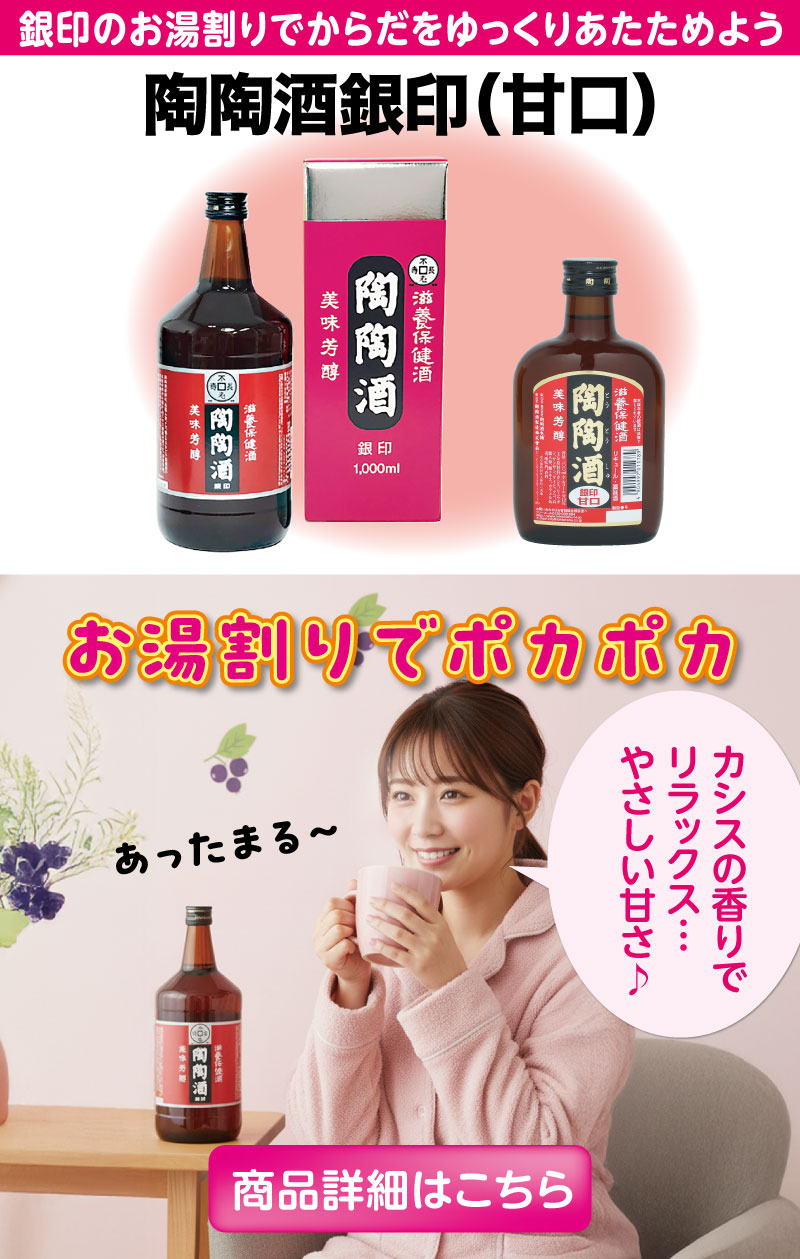 陶陶酒 銀印 は、マムシエキスや高麗人参をはじめ、10数種類の自然のエキスをバランスよく配合した健康酒です。