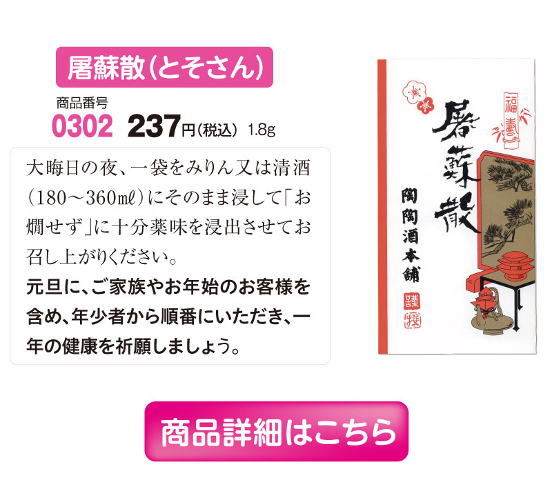そんな動きの年を迎えるにあたって、もうひとつ知っておきたいのが屠蘇(とそ)の風習です。