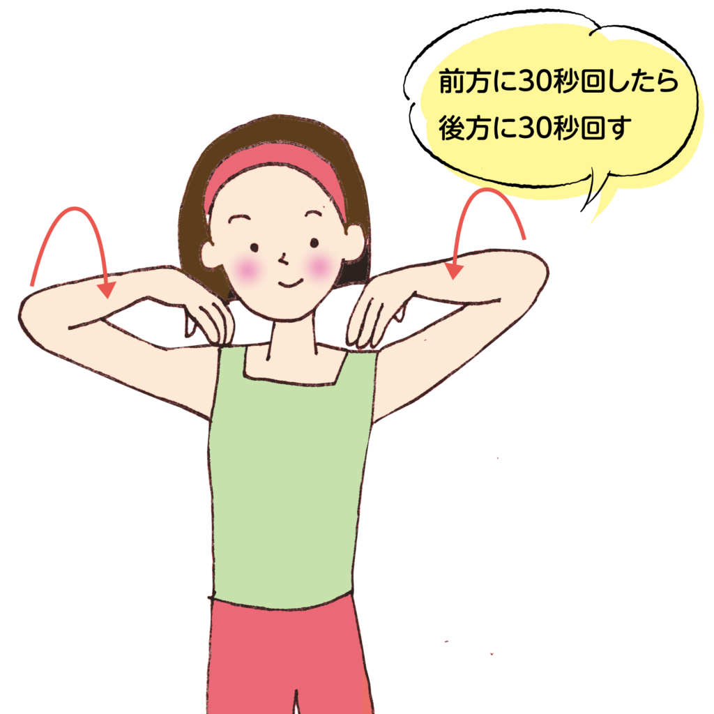 ② 肘が耳の横を通るように前方に30秒回します。