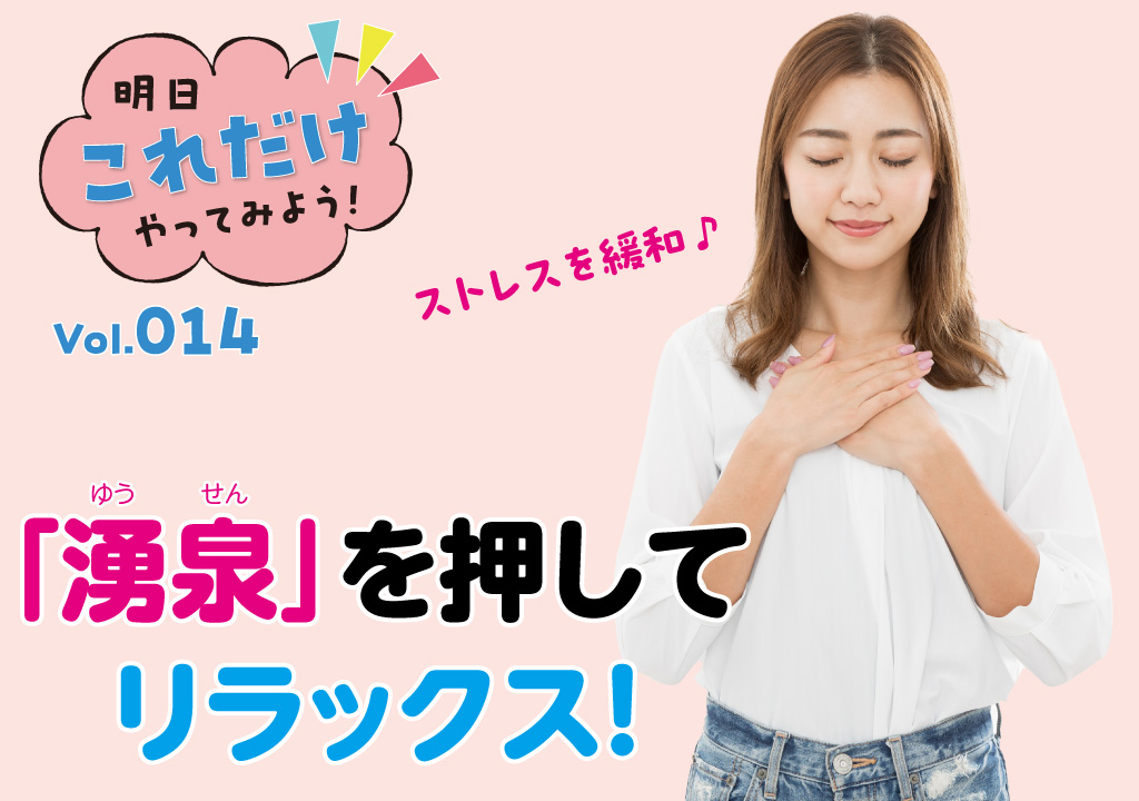 そこで「湧泉」をおすすめします。湧泉は、全身の体調を整え、リラクゼーション効果からストレスを緩和するといわれています。全身が温かい状態の風呂上りに押すと効果的です。