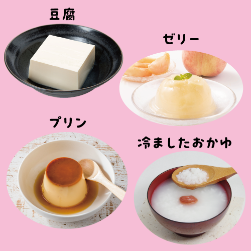 痛みが生じる時は豆腐・ゼリー・プリン、冷ましたおかゆなどがおすすめ!また、オレンジジュースのような酸味がある飲み物や炭酸水は口にしみるので、少し冷やした麦茶や牛乳がおすすめです。