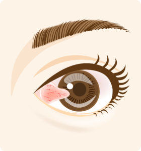 結膜の下にある細胞が繁殖して、目頭から角膜にかけて入り込む病気です。手術が必要ですが、翼状片は再発しやすく、放っておくと視力の低下にも関わる病気で、瞼裂斑同様に、結膜炎や雪眼炎を繰り返すと発症しやすくなります。