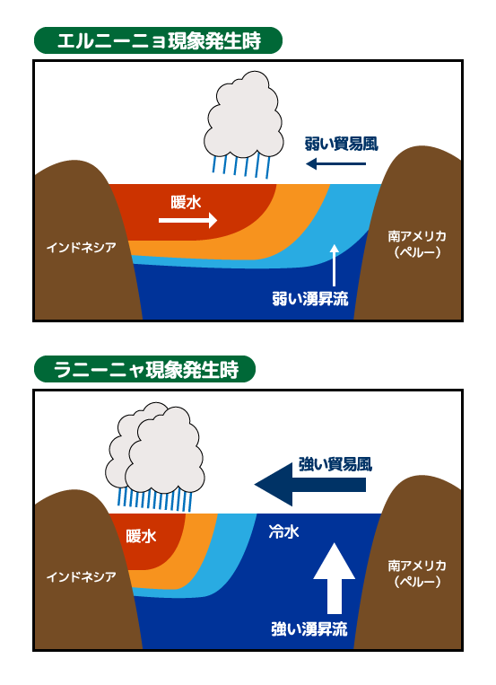 エルニーニョ現象とは、太平洋赤道域の日付変更線付近から南米のペルー沖にかけて海面水温が平年より高くなる状態が約1年続く現象で、反対に同じ海域で海面水温が平年より低い状態が続く現象はラニーニャ現象と呼ばれます。