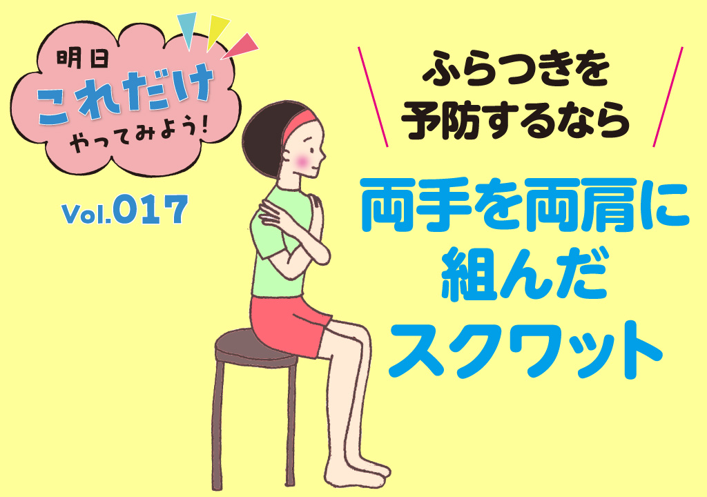 両手を両肩に組んだでスクワットで太ももの筋肉を鍛えて、ふらつきにくい身体にしましょう!