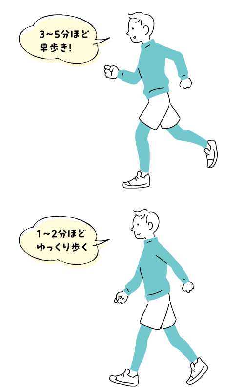 最初のうちは無理をせずに楽なほうを多めにして、体が慣れてきたら徐々に負荷がかかる方を多めにすると良いでしょう。運動前、運動中、運動後は必ず水分補給をしましょう。
