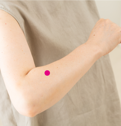 疲れや倦怠感を緩和させるツボ。肘の曲がり目から指3本分下がった位置を親指で押します。