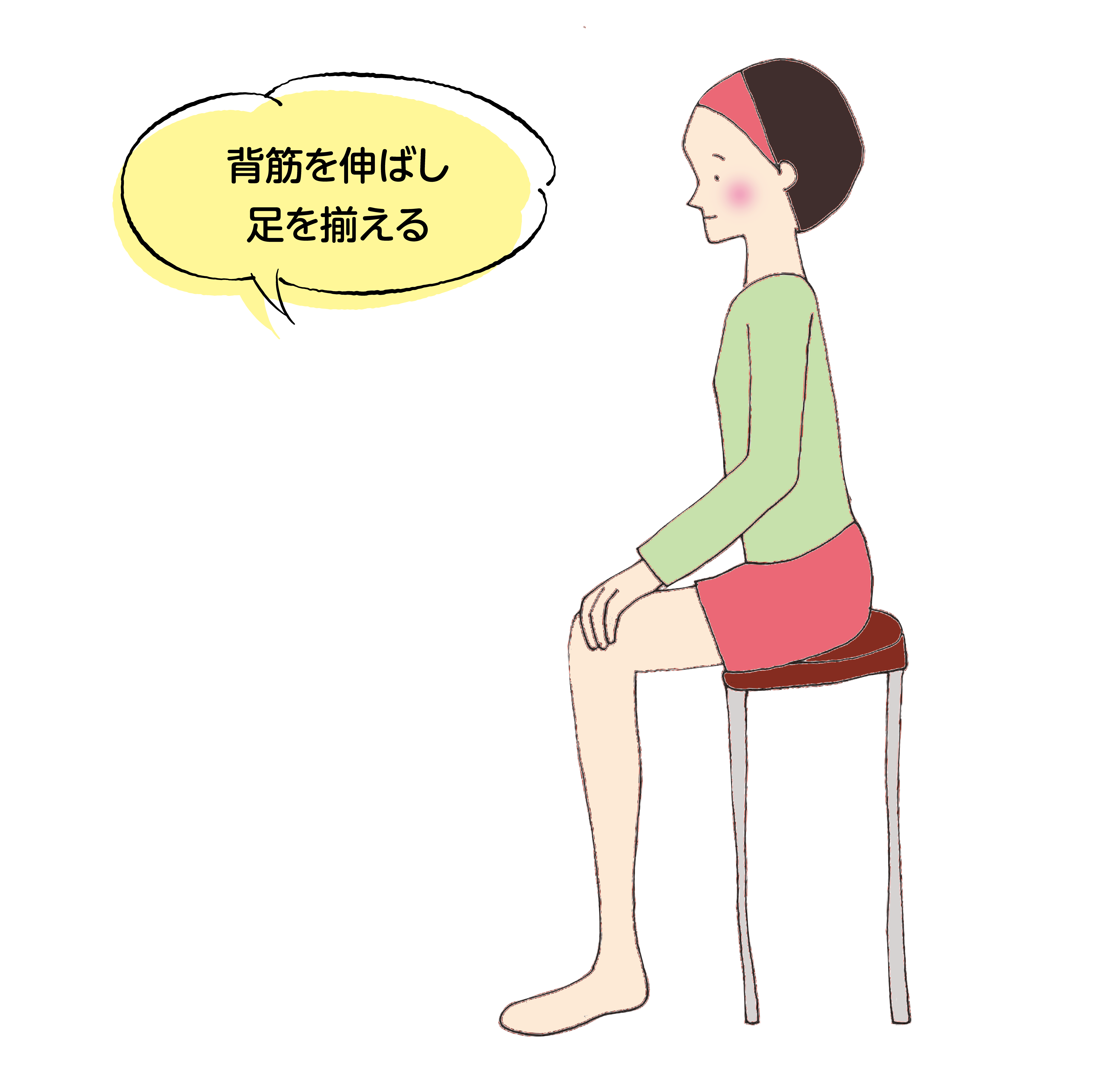 ①背筋を伸ばして椅子に座り、足を揃えます。