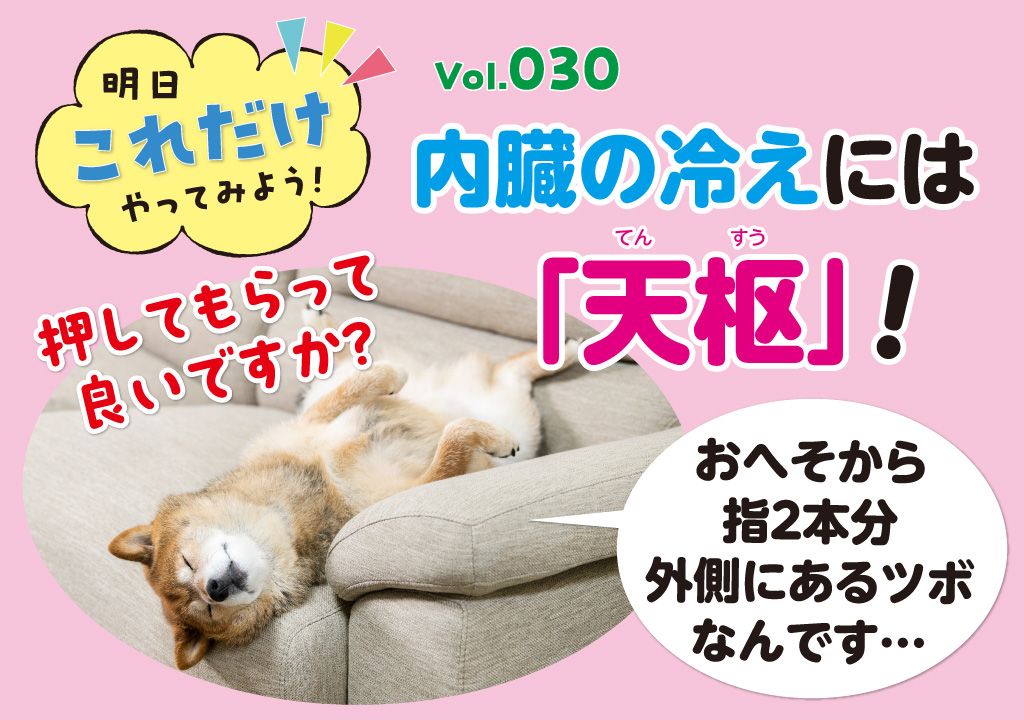 内臓冷えは、血液が集まる腸の血液が行き渡らず、全身の血流が悪化しているために、免疫力の低下や体調を崩す可能性があります。「天枢」は、冷えに良いツボとして有名であり、グッと押さえるだけで自律神経のバランスを整えて、血流改善に期待ができます。