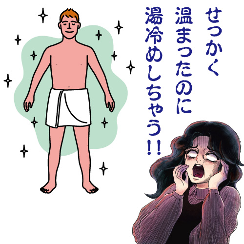 入浴後は体が火照っているため、薄着で涼んでから服に着替える人がいます。しかし、入浴後に涼んでしまうと、せっかく体の芯から温まっていたのに冷えてしまい、湯冷めにより体調を崩してしまう場合があります。