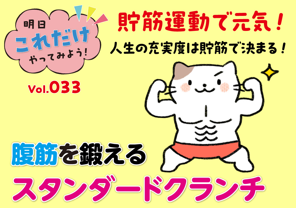 今回は、腹筋を鍛える「スタンダードクランチ」をご紹介します。スタンダードクランチは、おへそをのぞき込むように上体を起こす動きで、ゆっくりと動くため、無理なく腹筋を鍛えることができます。