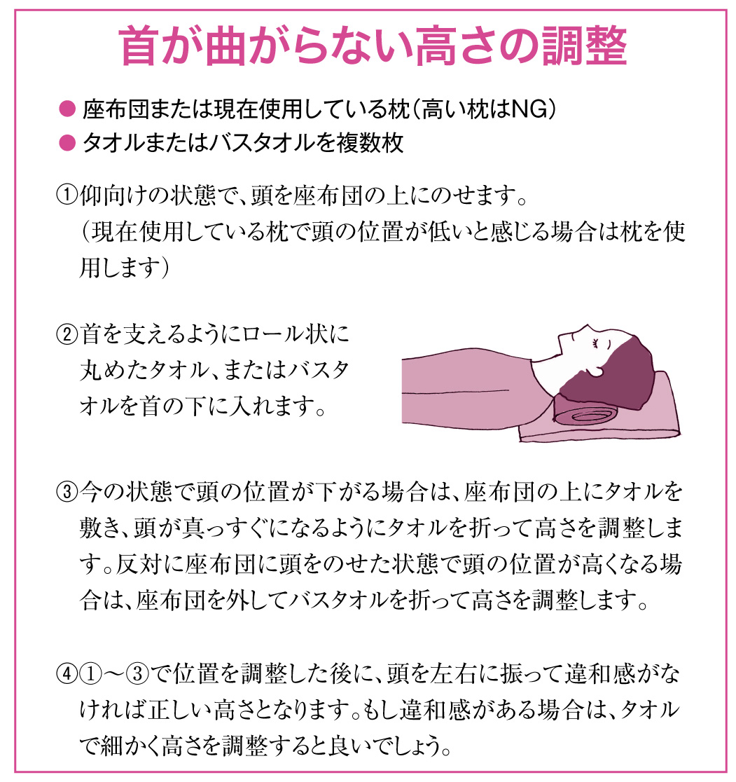 枕の高さは、専門店であれば体に合わせてオーダーメイドで作ってくれますが、枕の代わりにタオルや座布団を使って位置を調整することもできます。