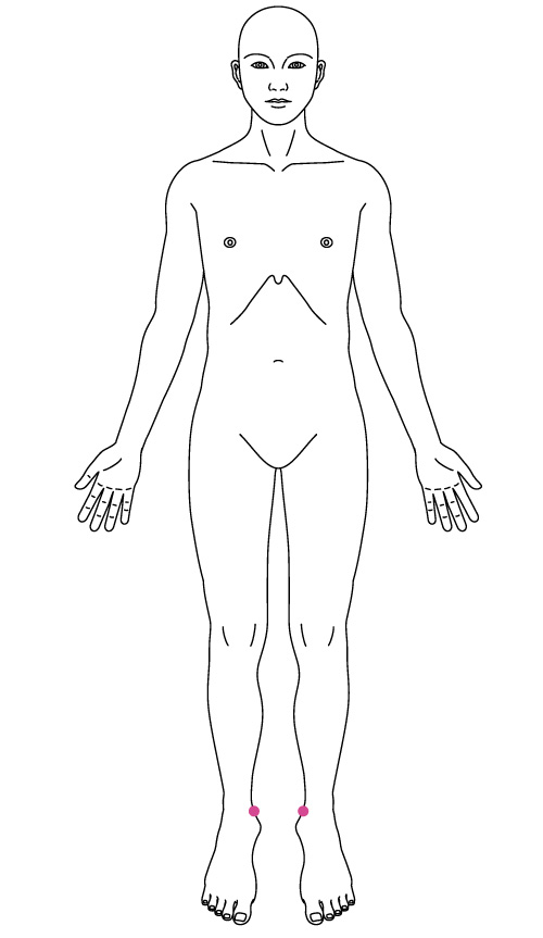 内くるぶしの後ろでアキレス腱側の大きな窪みの箇所にあり、アキレス腱を優しくつまむように5秒間隔で押します。(30秒)