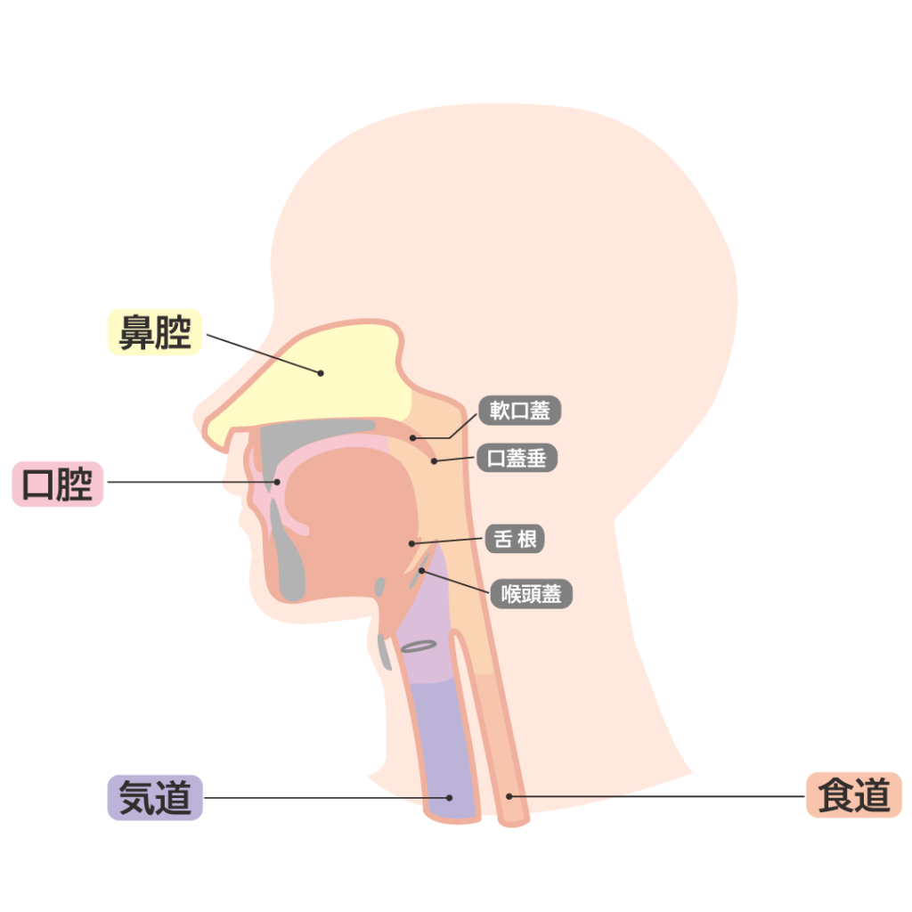上気道が狭くなるのは、喉の奥にある軟口蓋(なんこうがい)や口蓋垂(こうがいすい)、舌根(ぜっこん)、喉頭蓋(こうとうがい)が重力で落ち込みやすいことが原因です。他にも気道の壁が狭くなる原因に体型が関わる場合があります。