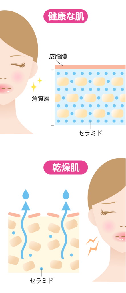 肌の一番外側には「角質層」と呼ばれる層があり、肌の「保湿」と「バリア機能」の役割があります。乾燥すると、角質層の水分量が減少し、皮脂の分泌が低下して、ターンオーバー(肌の細胞の生まれ変わり)が滞り、肌荒れなどの原因になります。角質層のバリア機能が低下すると、乾燥肌になりやすくなります。