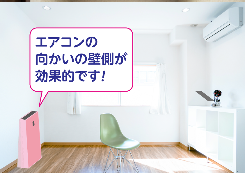空気清浄機をエアコンの向かいの壁側に置くと、エアコンの運転で起こる気流との相乗効果でより効果的な空気清浄が期待できます。そしてエアコンによる温度ムラも抑えられ、エアコンの節電にも効果的です。
