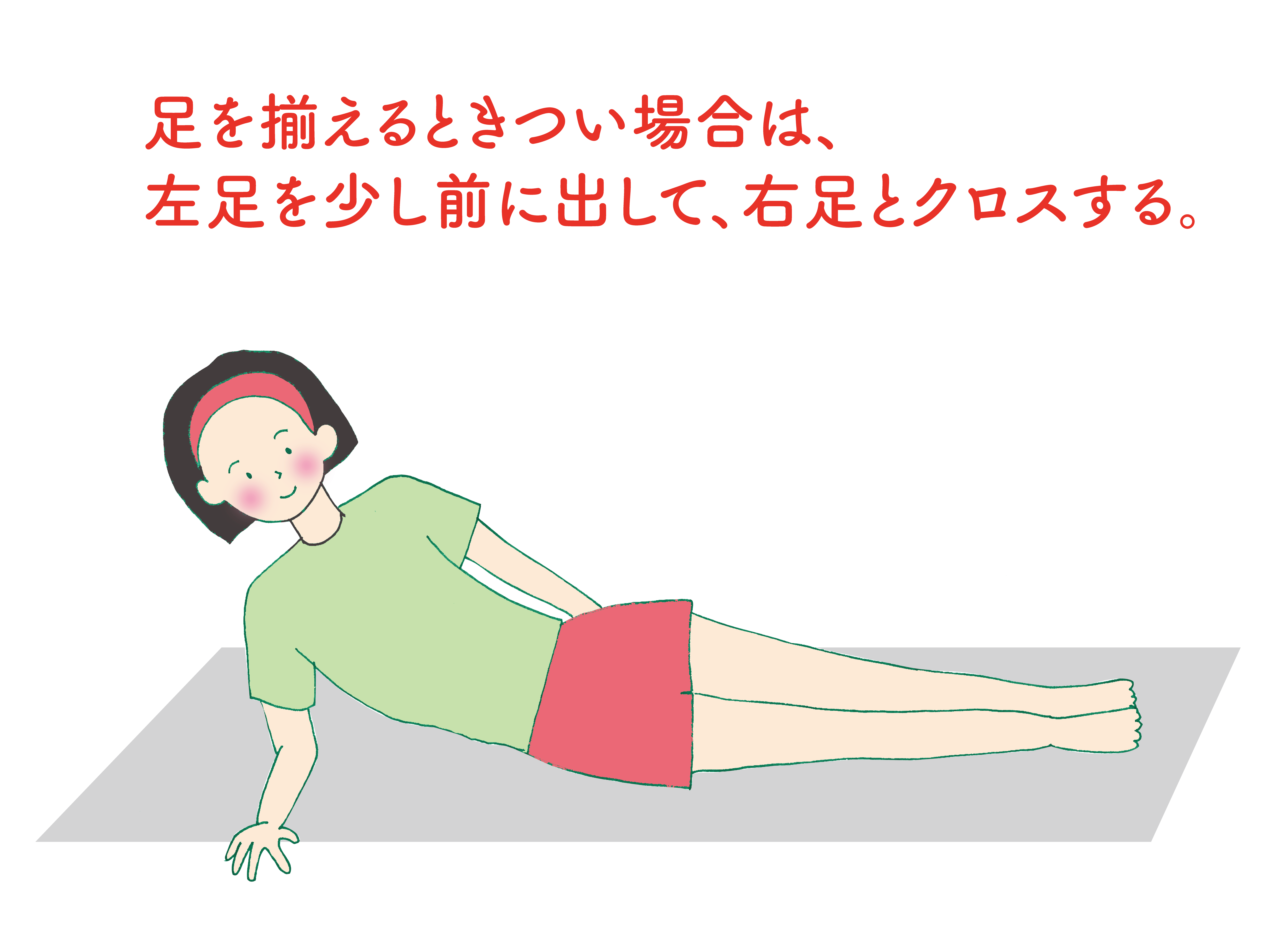 1.右肘を床につき、お尻の側面を床につけて寝そべります。