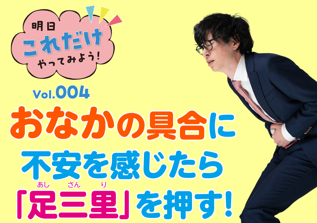 そこで、今回はおなかの健康に役立つ「足三里(あしさんり)」を紹介します。足三里は、血流を促し、腹痛を感じた時やおなかが張る時、また足の疲れに良いといわれるツボです。おなかに不調を感じた時に押してみましょう。