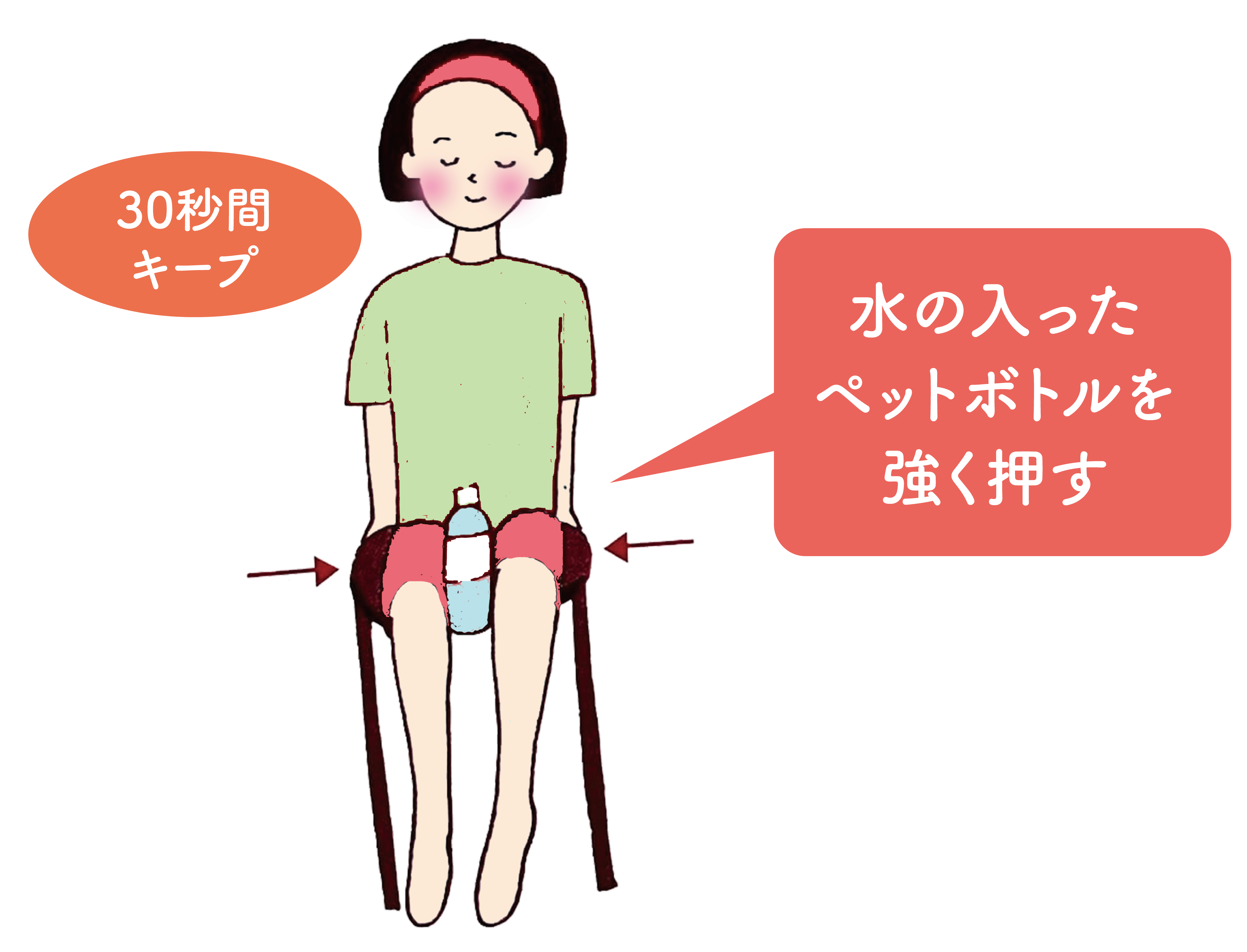 - 椅子に浅く座り、両ひざで水が入ったペットボトル(500ml)を挟みます。