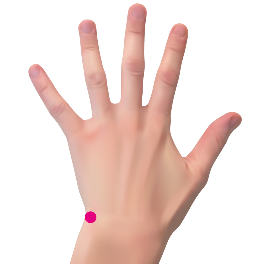 手の甲側にあり、小指と手首のラインが交差する窪み(ボコッと出ている骨の際)にあるツボ。