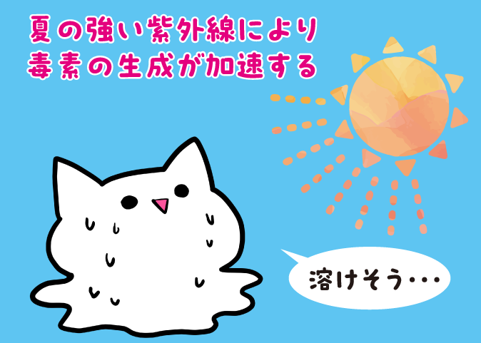 また、強い紫外線により体内で活性酸素を増加させ、活性酸素が細胞を傷つけて毒素の生成が加速します。