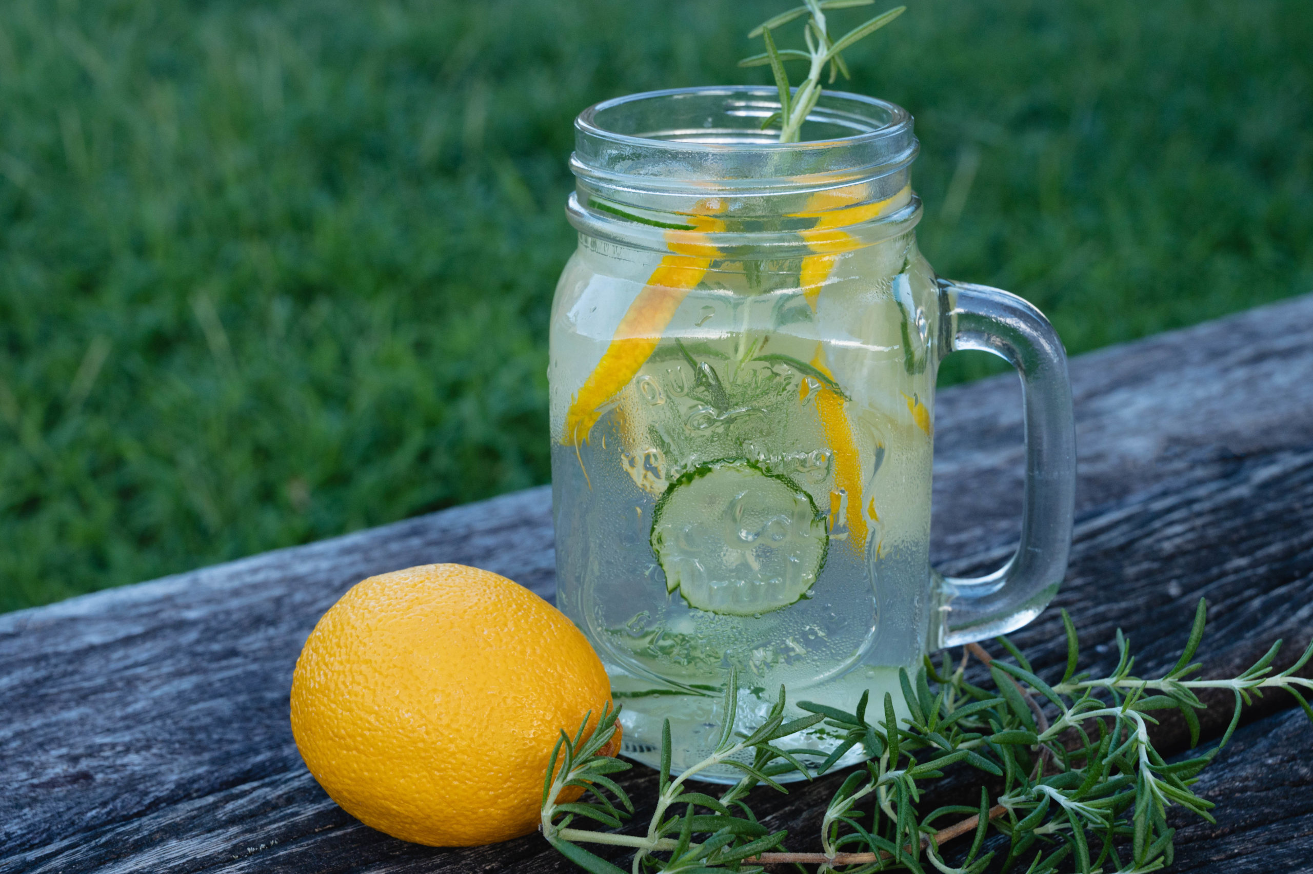 | ① | レモンやローズマリー(ミントでも可)、キュウリをよく洗う。 レモンとキュウリは薄くスライスし、ローズマリーは軽く叩いて香りを出します。 |