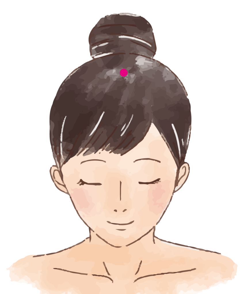 左右の耳の上を頭で結んだところと顔の中央が交わって少し凹んでいる場所にあるツボ。気持ち良いと感じる強さで3秒間押して離すを繰り返しましょう。(約1分)