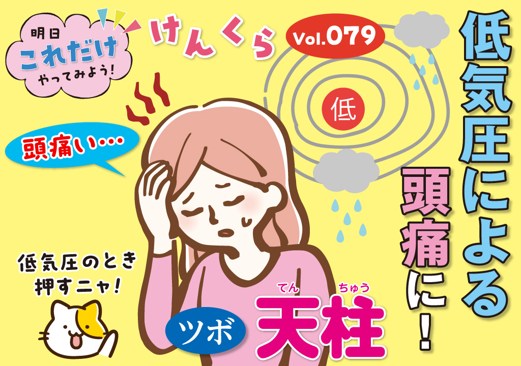 天柱(てんちゅう)は、頭痛や肩こりにおすすめのツボです。首と肩のコリをほぐして頭の血流を促します。とくに低気圧による頭痛の改善に役立ちます。