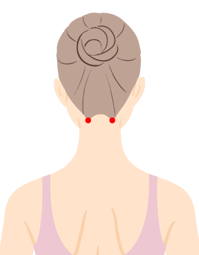 首のうしろの髪の生え際にあり、中央のくぼみから左右に触れる太い筋繊維の外側にあるツボ。