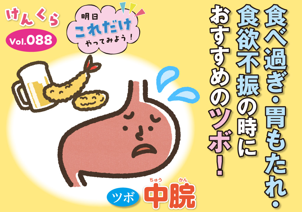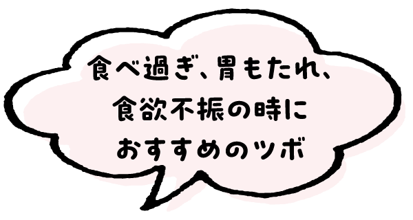 胃腸の不調には「中脘(ちゅうかん)」を刺激。おへその上にあり、消化を助けます。
