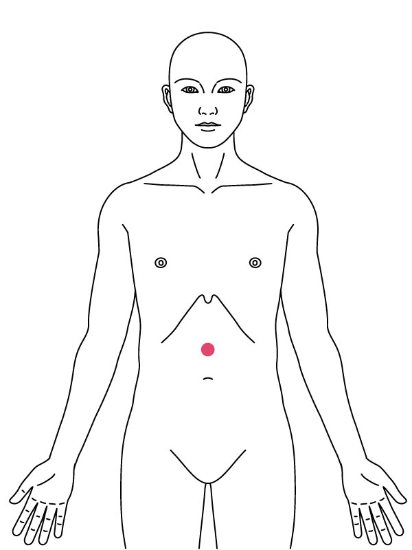 おへそとみぞおちをまっすぐに結んだ線上の中間に位置する箇所を優しく5秒間隔で押します。