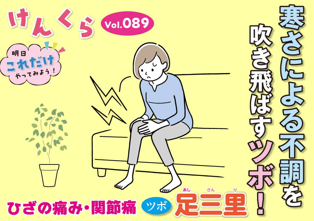 膝の関節痛には「足三里(あしさんり)」が有効で、足のすねに位置し、関節の痛みを和らげます。ぜひ毎日取り入れて寒さを乗り切りましょう。