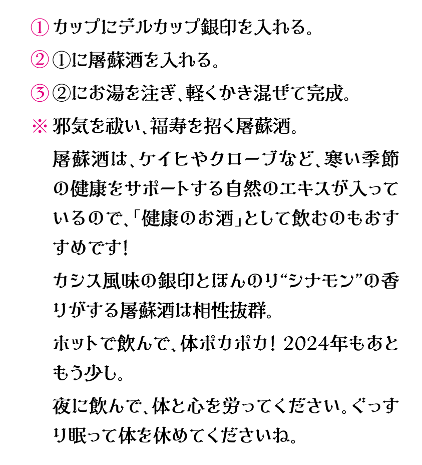 デビルズ通信 Vol.089番外編 屠蘇酒割り 2024年12月29日 @kenkura デビルズ通信 2024年12月29日 2025年の健康祈願!屠蘇散(とそさん)・屠蘇酒(とそしゅ)はこちら >>次回、デビルズ通信Vol.090は、1月4日(土)深夜24時更新!<<デビルズ通信 Vol.088 レンジでつくる!ミートローフ