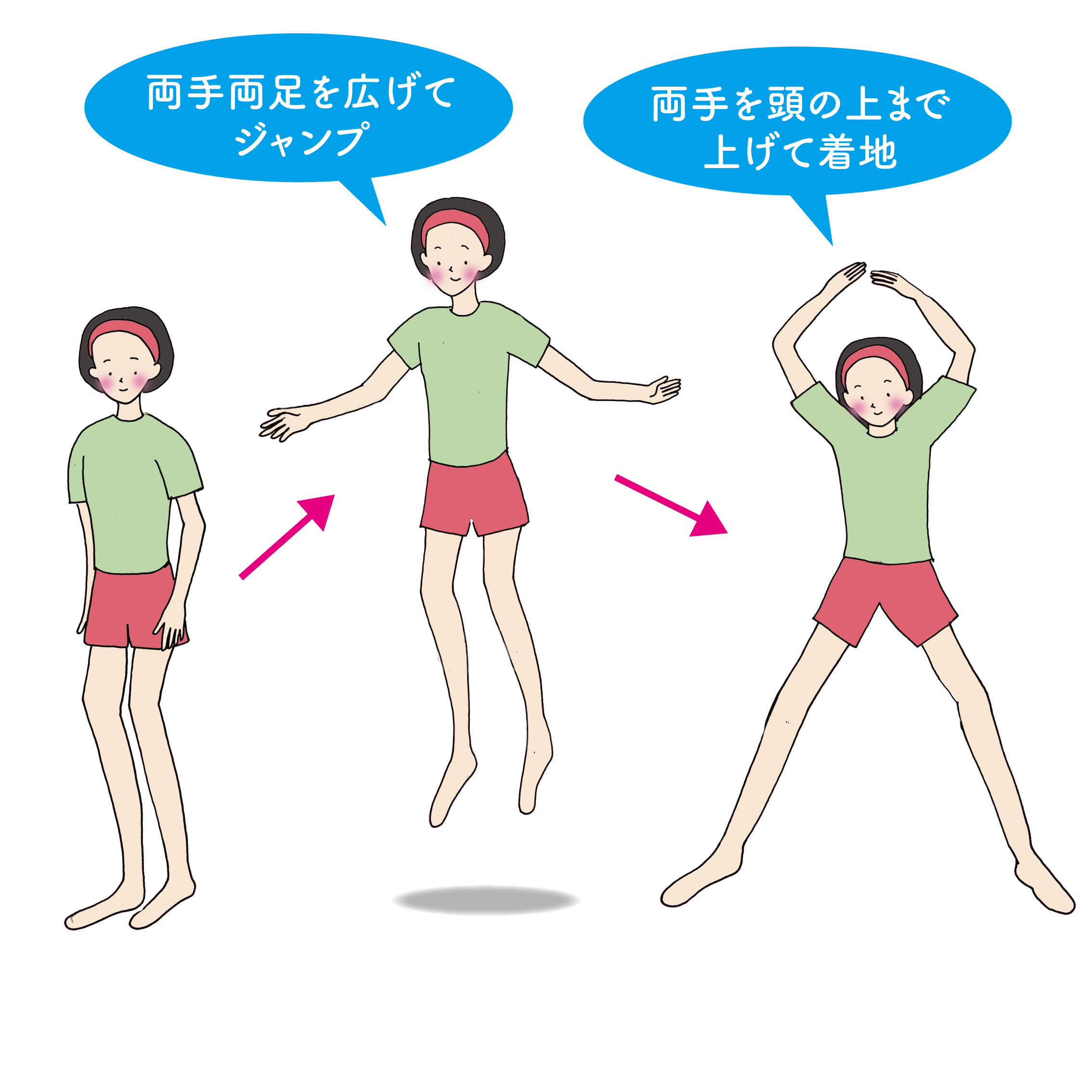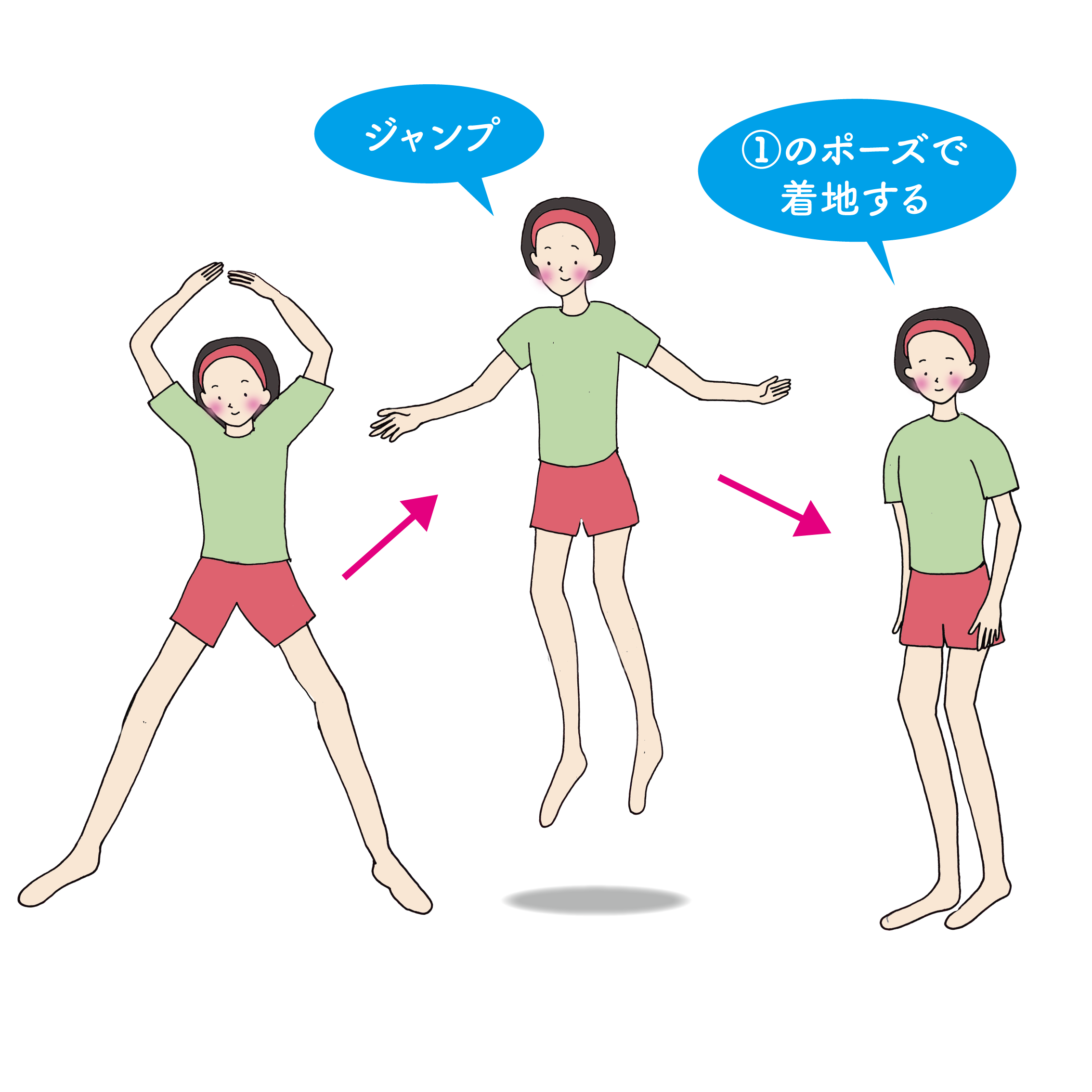 ② ジャンプすると同時に両手・両足を広げてジャンプし、両手を頭の上まで上げて着地する。