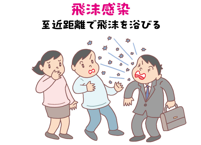 通常は、1〜2m以内の至近距離で飛沫を浴びることで感染するのが特徴です。