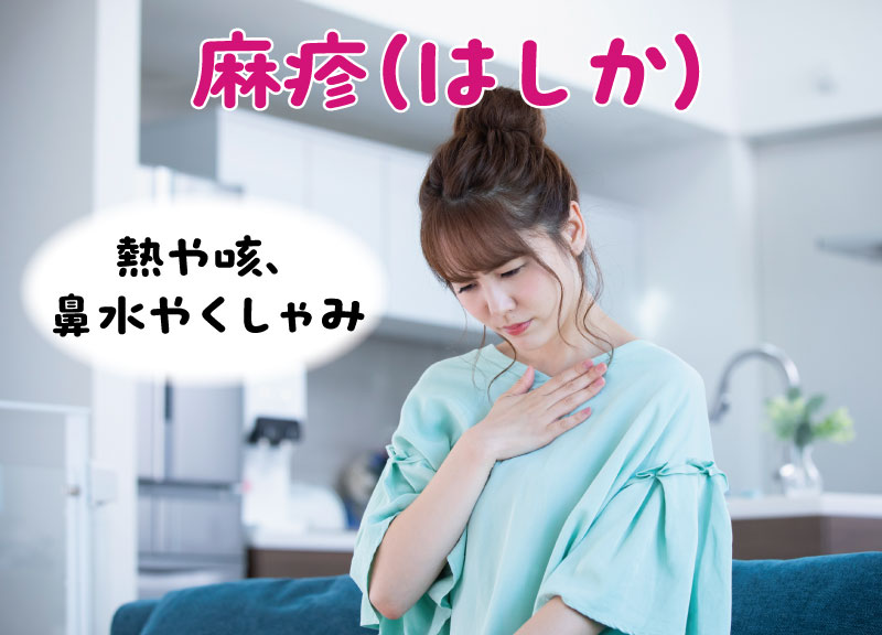 麻疹(はしか)は、麻疹ウイルスにかかることで発症する感染症です。感染すると、熱や咳、鼻水やくしゃみなどの症状が現れます。感染力は非常に高く、幼児から大人まで重症化することもあります。