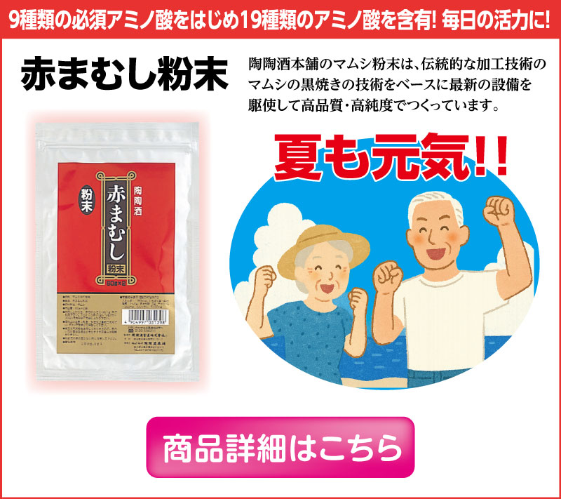 そこでおすすめなのが「赤まむし粉末」です。古くから健康に役立つと愛されてきたマムシには、人間の体に必要な9種類の必須アミノ酸をはじめ、合計19種類ものアミノ酸がバランス良く凝縮されています。