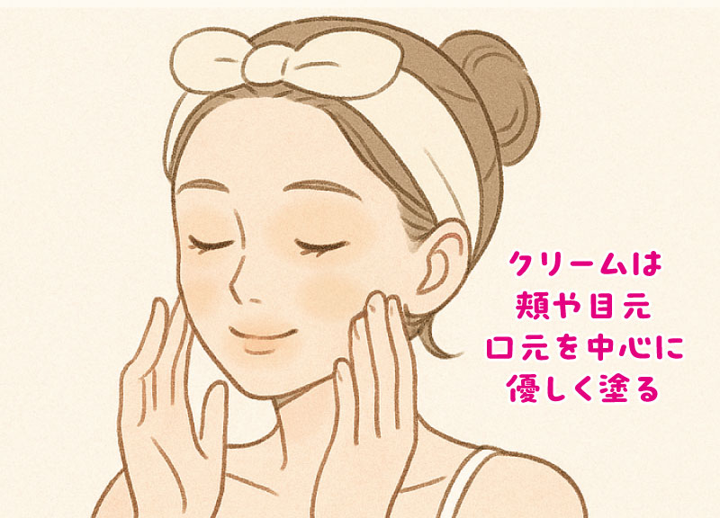 ④吉祥天クリームを指先に適量取り、乾燥が特に気になる頬や目元、口元を中心に優しく包み込むように塗ります。肌をこすらないように軽く押さえるようになじませるのがポイントです。