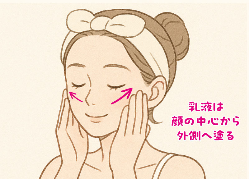 化粧水は手で軽く温め、顔全体に包み込むように馴染ませるのがポイントです。