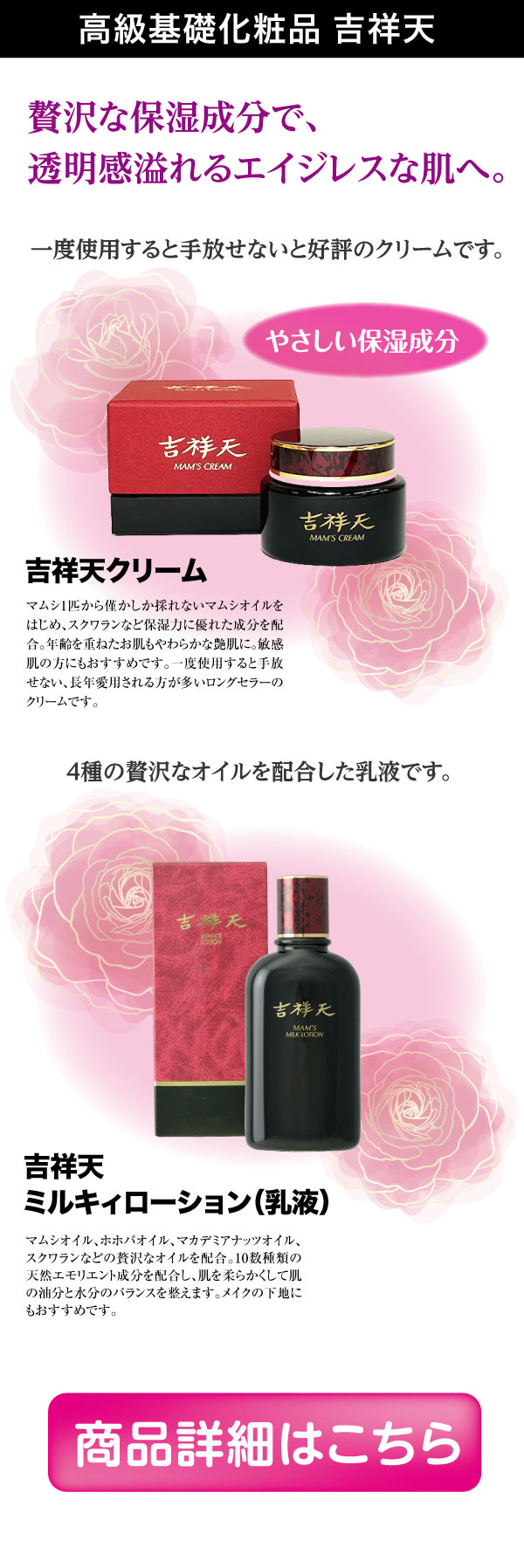 さらにコクのある「吉祥天クリーム」が潤いを逃さず閉じ込め、乾燥や肌荒れから守ります。